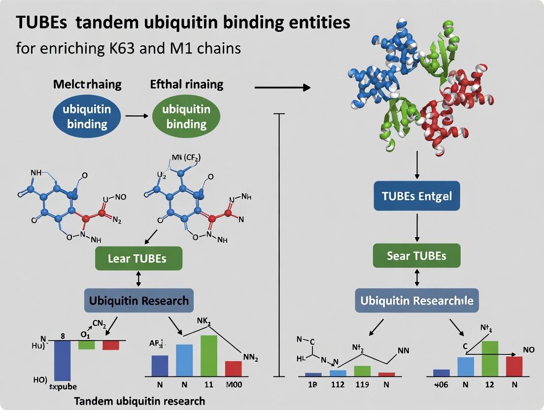Mastering TUBE technology for K63 and M1 ubiquitin chain enrichment provides researchers with a powerful, specific tool to dissect complex signaling networks central to human health and disease. As outlined, success requires a solid grasp of ubiquitin biology, a meticulous and optimized experimental protocol, rigorous troubleshooting, and thorough validation against gold standards. When implemented correctly, TUBEs offer superior selectivity for these non-degradative chains compared to pan-ubiquitin approaches, enabling clearer insights into pathways driving inflammation, genomic instability, and immune regulation. Future directions will involve the development of next-generation TUBEs with even greater specificity, their application in single-cell proteomics, and the direct translation of findings into drug discovery—particularly in targeting ubiquitin enzymes in immuno-oncology. By standardizing and refining these methodologies, the research community can accelerate the decoding of the ubiquitin code and its therapeutic exploitation.