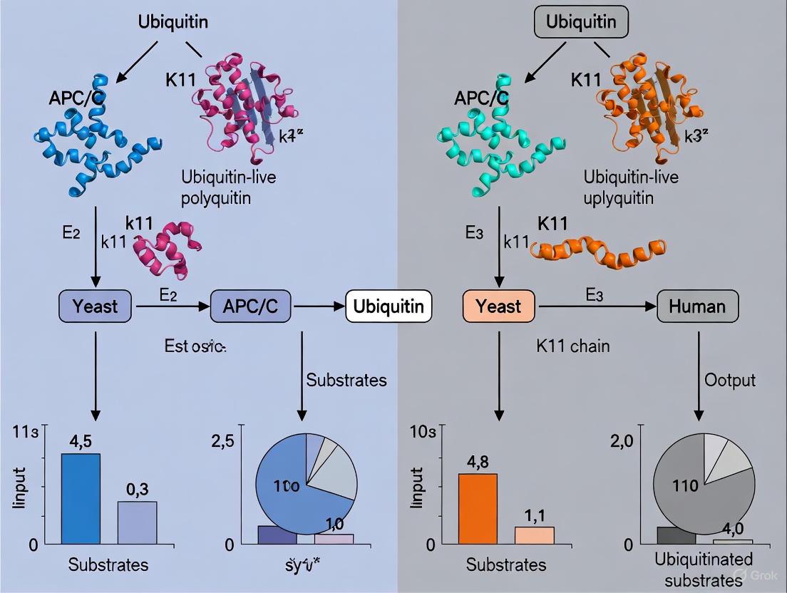 This article provides a comprehensive comparison of K11-linked ubiquitin chain utilization by the Anaphase-Promoting Complex/Cyclosome (APC/C) in yeast versus humans. Aimed at researchers and drug development professionals, it explores the foundational biological differences, established through genetic and structural studies. It details the methodologies for studying these distinct pathways, addresses key technical challenges, and validates comparative biological functions. The synthesis highlights how evolutionary divergence in APC/C mechanism informs fundamental cell biology and presents emerging therapeutic opportunities, particularly in targeting dysregulated cell cycle machinery in cancers and other pathologies.