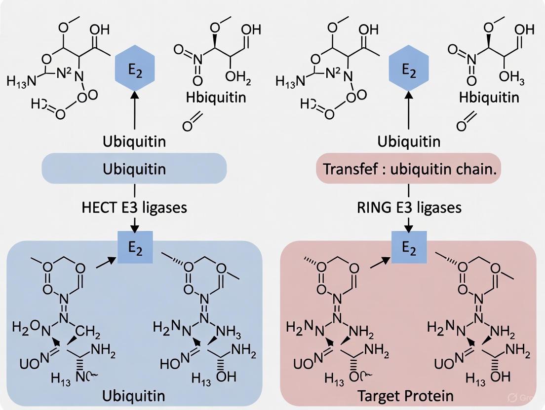 | E3 (Ligase) | ~600-700 [1] [6] | Substrate recognition & ubiquitin ligation | RING: Scaffold for direct transferHECT: Two-step with E3~Ub intermediateRBR: Hybrid mechanism | Provides substrate specificity; largest family |